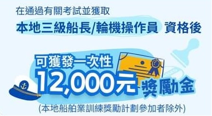 考獲本地船隻船長三級或本地輪機操作員三級證明書可獲港幣12,000元的一次性的資助