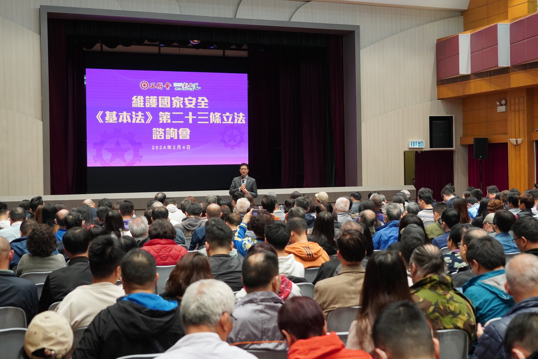 特區政府就《基本法》第23條立法進行公眾諮詢,工聯會今日(2月4日)舉辦線上線下諮詢會,由工聯會會長、立法會議員吳秋北,理事長、立法會議員黃國,以及工聯會立法會議員梁子穎、陳穎欣向工會理幹事、地區社