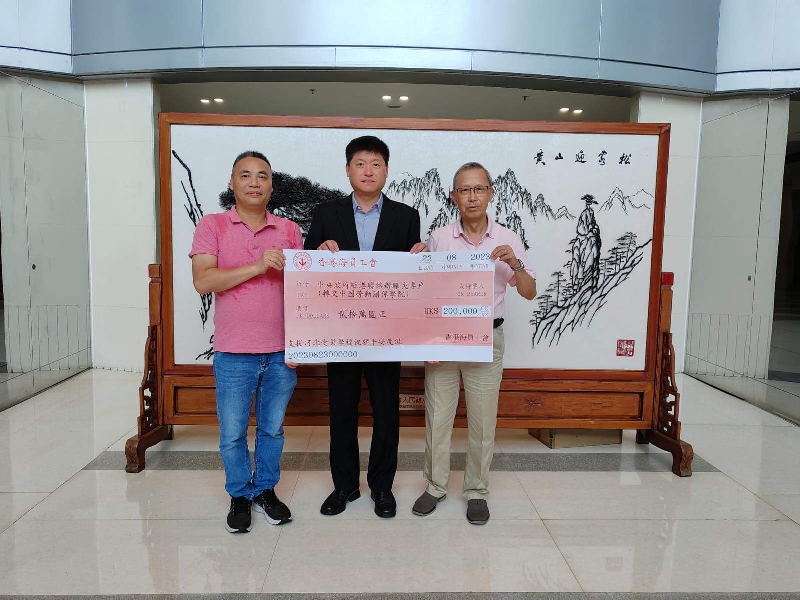 近日,受超強颱風(杜蘇芮)影响,京津冀及東北等地出現極端降雨,引發洪澇和地貭災害。今天工會透過中央政府駐港聯络辦公室轉送20萬港元,支援河北受災學校。由張世添主席及楊開強副主席轉交中聯辦社工部副部長周蔚代表接收,祝願河北同胞平安度汛。