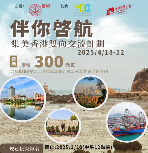 報名連結: https://forms.gle/qRd1gz3nxwTqHQcq8 主辦:香港海員工會活動獲民政及青年事務局和青年發展委員會合辦的「青年內地交流資助計劃」資助「伴你啓航」集美香港雙向交