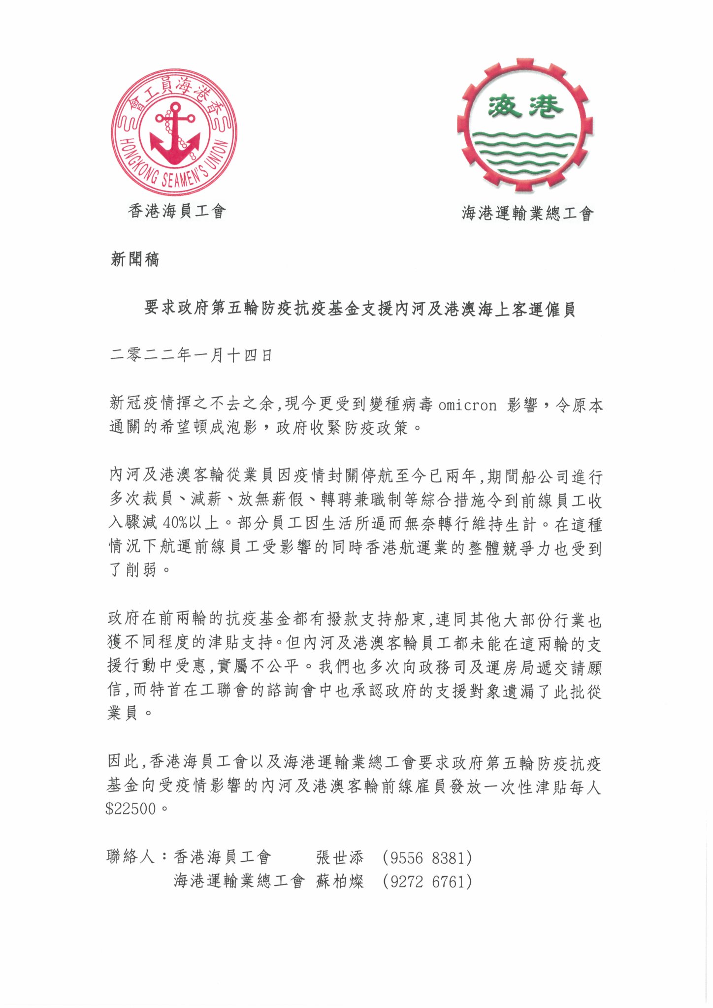 > 要求政府第五輪防疫抗疫基金支援內河及港澳海上客運僱員