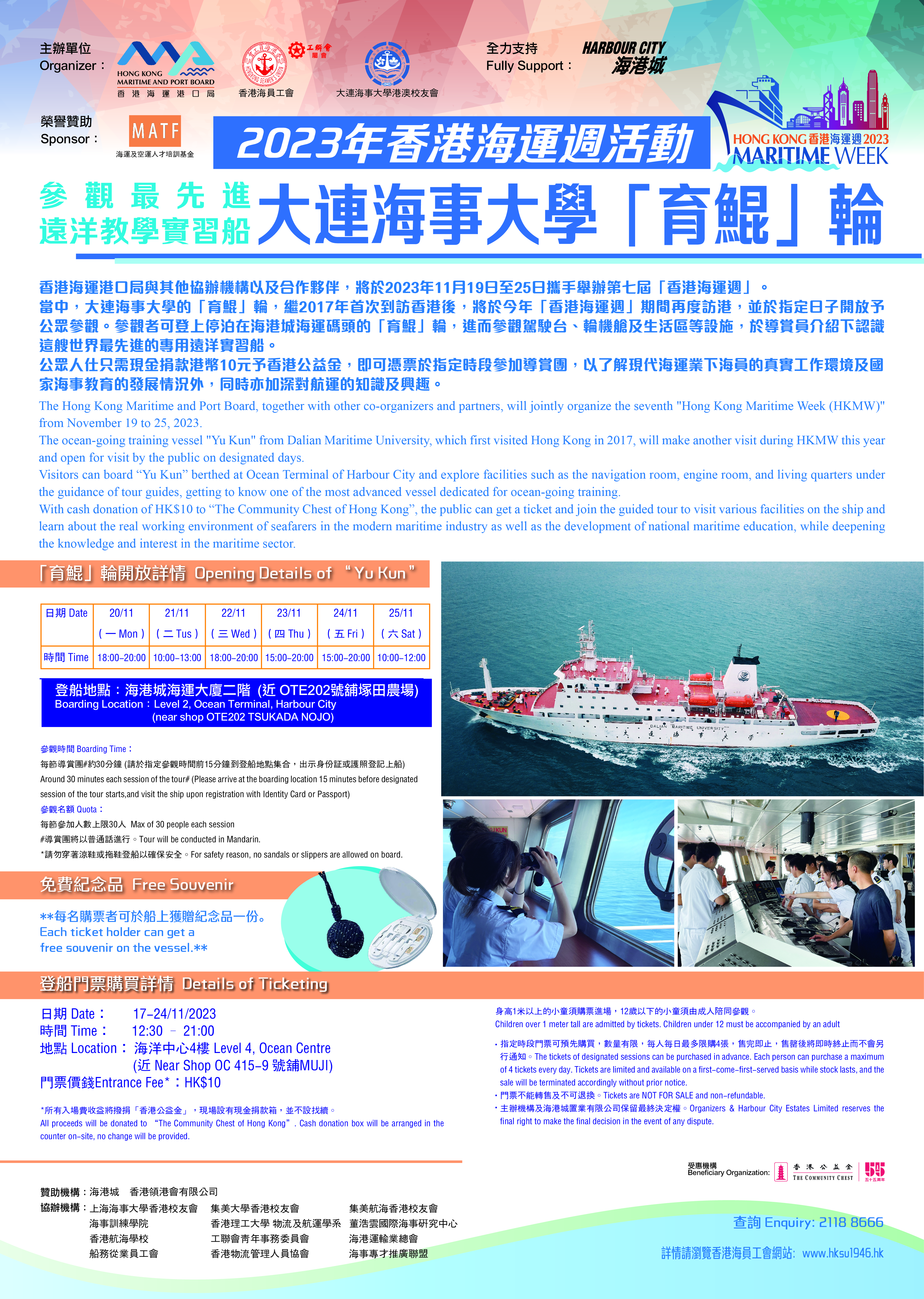 Boarding Time:Around 30 minutes each session of the tour# (Please arrive at the boarding location 15 minutes before designated session of the tour starts, and visit the ship upon registration with Identity Card or Passport)