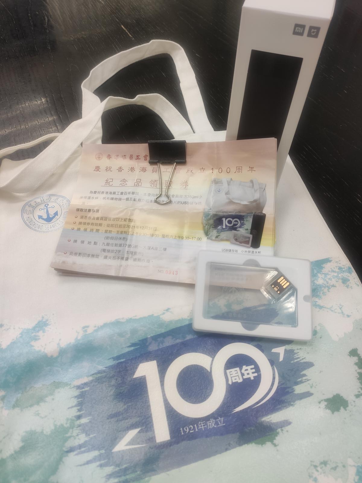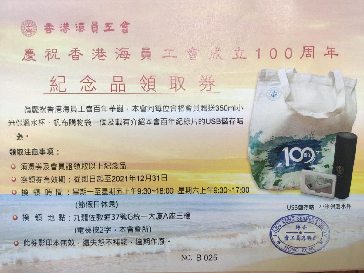 為了答謝各會員一直以來的支持,工會為所有合資格會員準備了一份紀念品,包括一張載有工會紀錄片的「USB儲存咭」、一個小米保溫水杯以及一個帆布購物袋。信函已寄出,並附上紀念品領取券一張,會員可於2021年12月31日前攜帶領取券及會員證到工會領取(親友代領亦需攜帶領取券及會員證)。